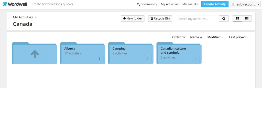 Wordwall is a very useful interactive lesson-creation site. If you sign up for a free Wordwall account, you will be able to see our “Canada” folder, which includes ESL Directions activities that you can add to your lessons.