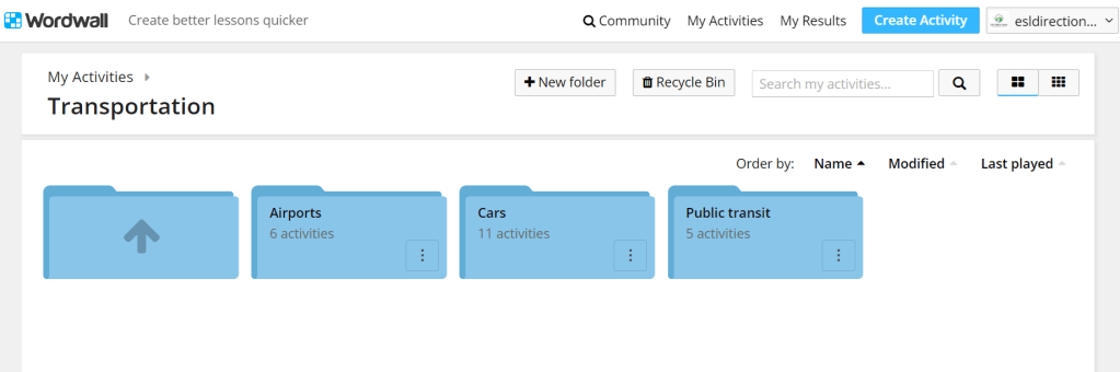 Wordwall is a very useful interactive lesson-creation site. If you sign up for a free Wordwall account, you will be able to see our “Transportation” folder, which includes ESL Directions activities that you can add to your lessons.
