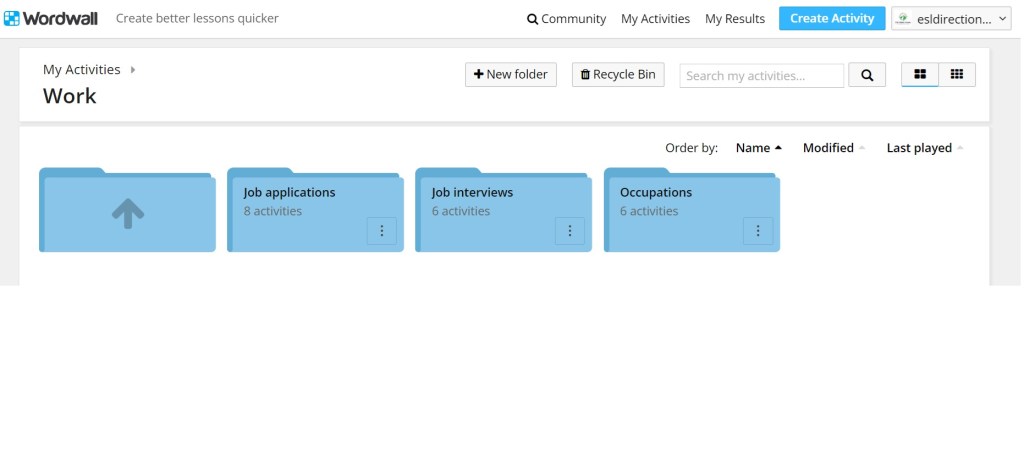 Wordwall is a very useful interactive lesson-creation site. If you sign up for a free Wordwall account, you will be able to see our “Work” folder, which includes ESL Directions activities that you can add to your lessons.